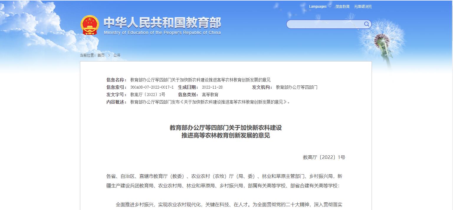 教育部辦公廳等四部門關(guān)于加快新農(nóng)科建設(shè)推進(jìn)高等農(nóng)林教育創(chuàng)新發(fā)展的意見