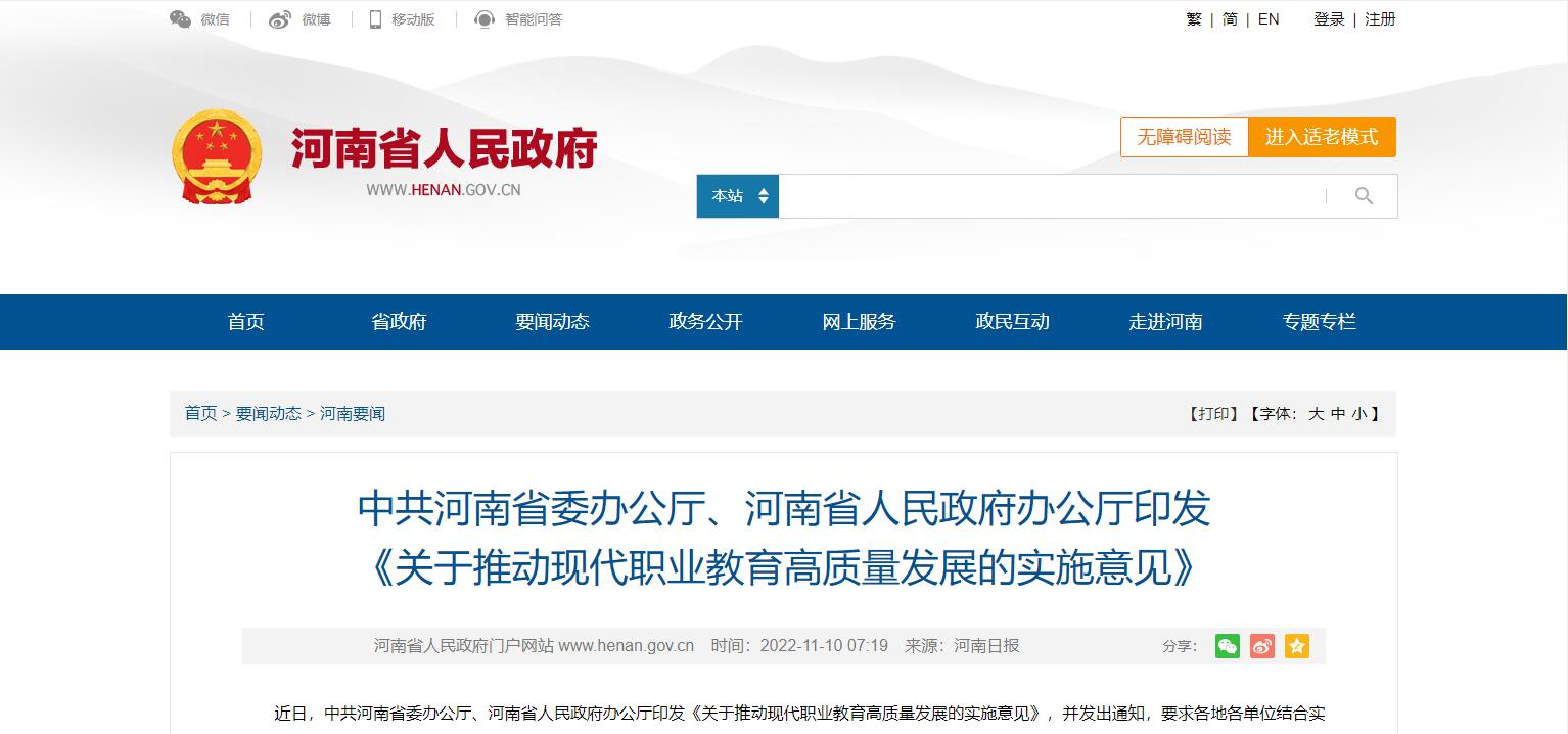 中共河南省委辦公廳、河南省人民政府辦公廳印發(fā) 《關(guān)于推動(dòng)現(xiàn)代職業(yè)教育高質(zhì)量發(fā)展的實(shí)施意見》